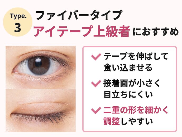 アイテープは3タイプあり、「片面タイプ」「両面タイプ」「ファイバータイプ」と種類も豊富で自然な二重の演出が可能です。